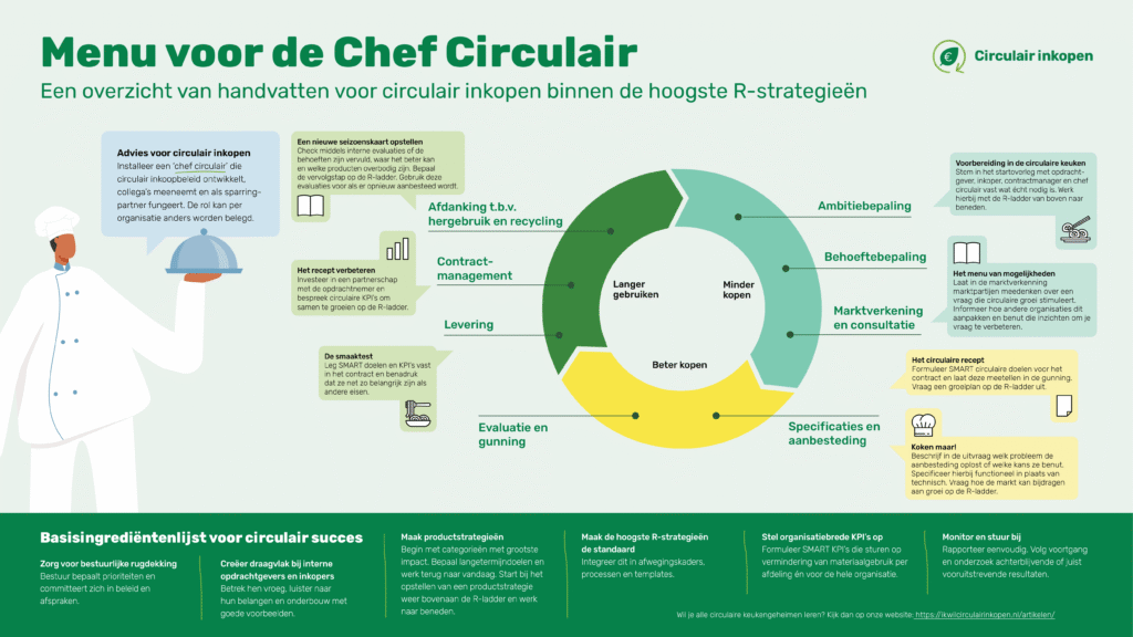 ‘Stel iemand aan die verantwoordelijk is voor circulair inkopen in de organisatie: een ‘chef circulair’. Deze persoon ontwikkelt het circulaire inkoopbeleid, ondersteunt collega’s en helpt om de hoogste R-strategieën uit te rollen. Hoe je die rol invult, verschilt per organisatie.
