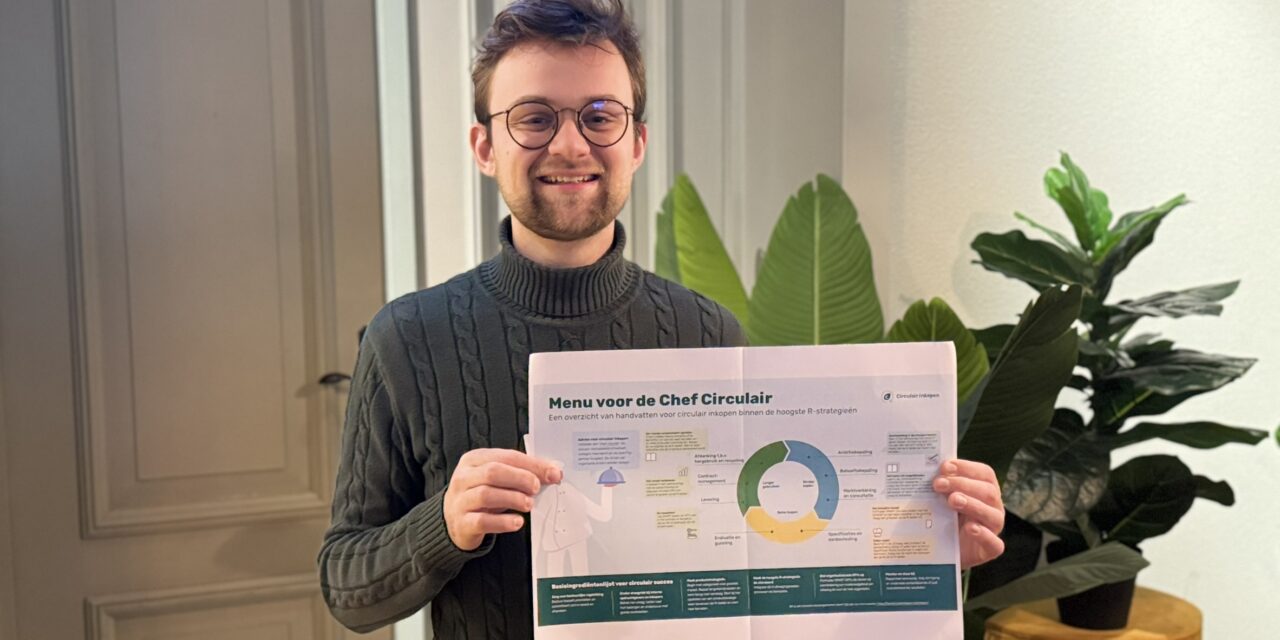 We spraken Pieter van Meijeren, student Bedrijfskunde aan de CHE. Voor zijn afstuderen maakte hij een overzichtsplaat met handvatten voor circulair inkopen binnen de hoogste R-strategieën. Ook werkte hij aan de MVOI-wegwijzer met circa 160 bronnen die inkopers direct kunnen toepassen.